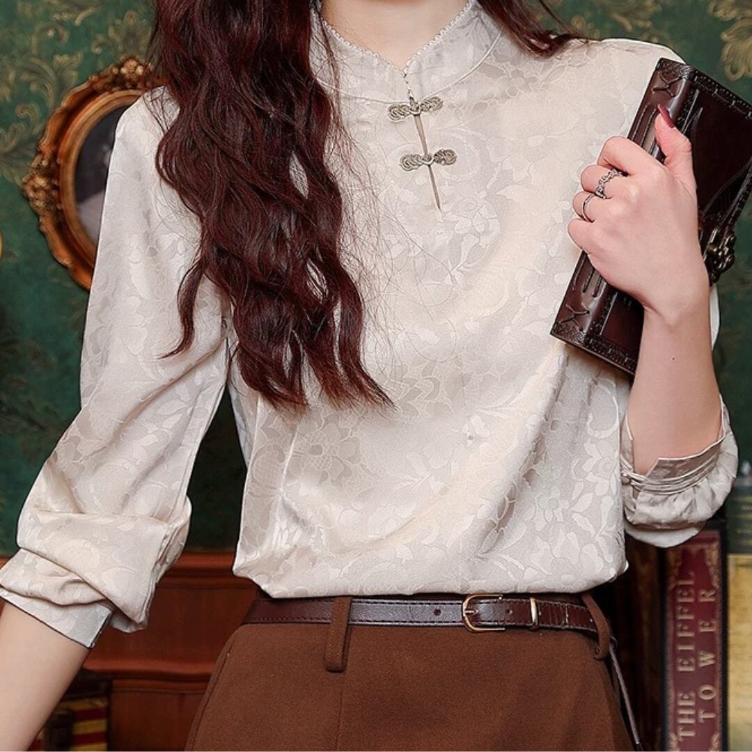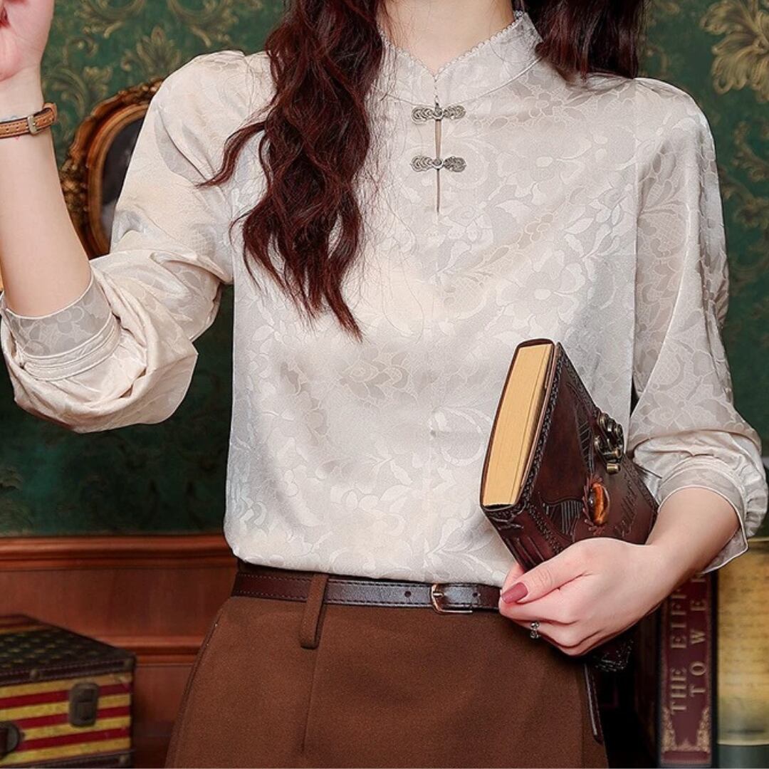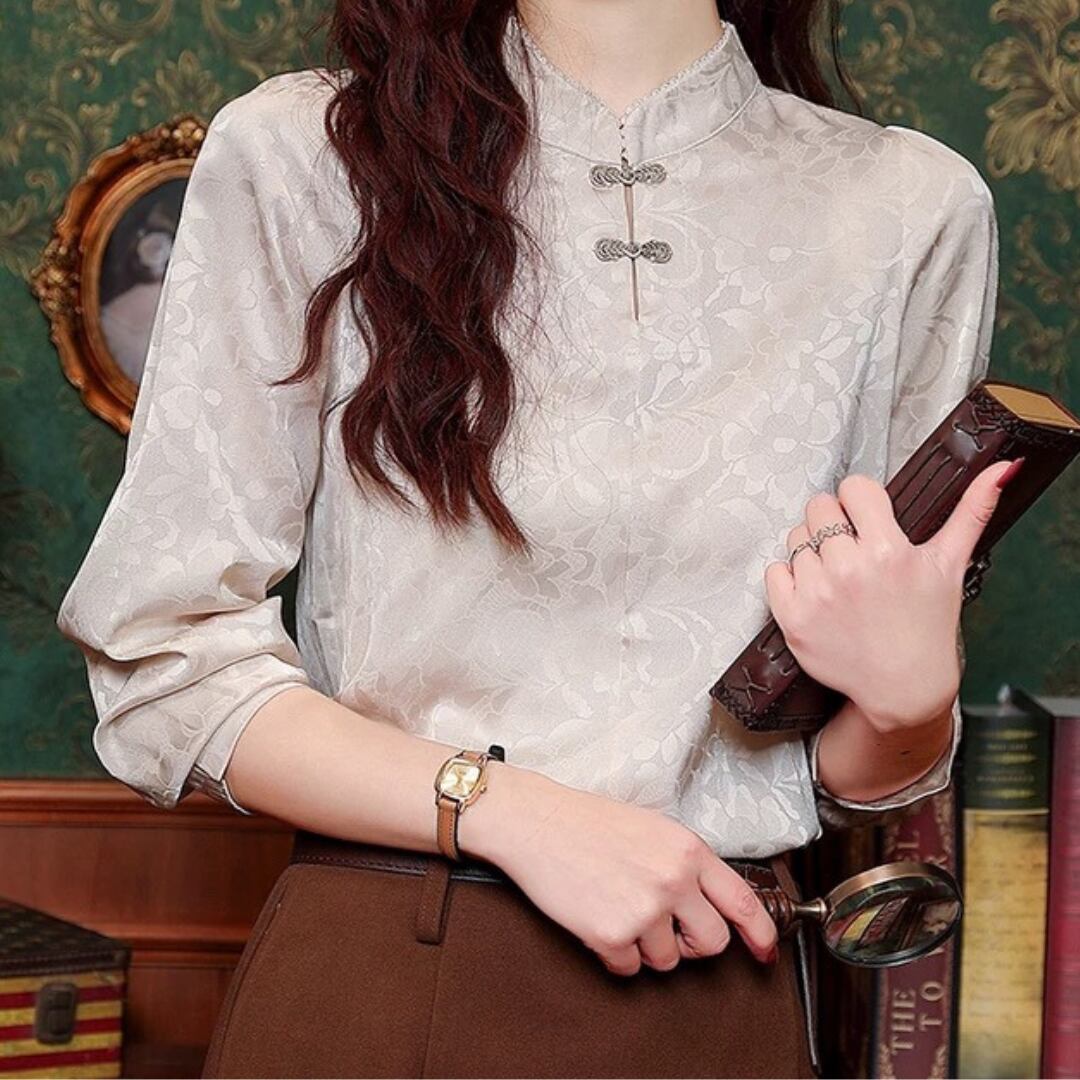 エレガントなチャイナ風デザインのブラウス。